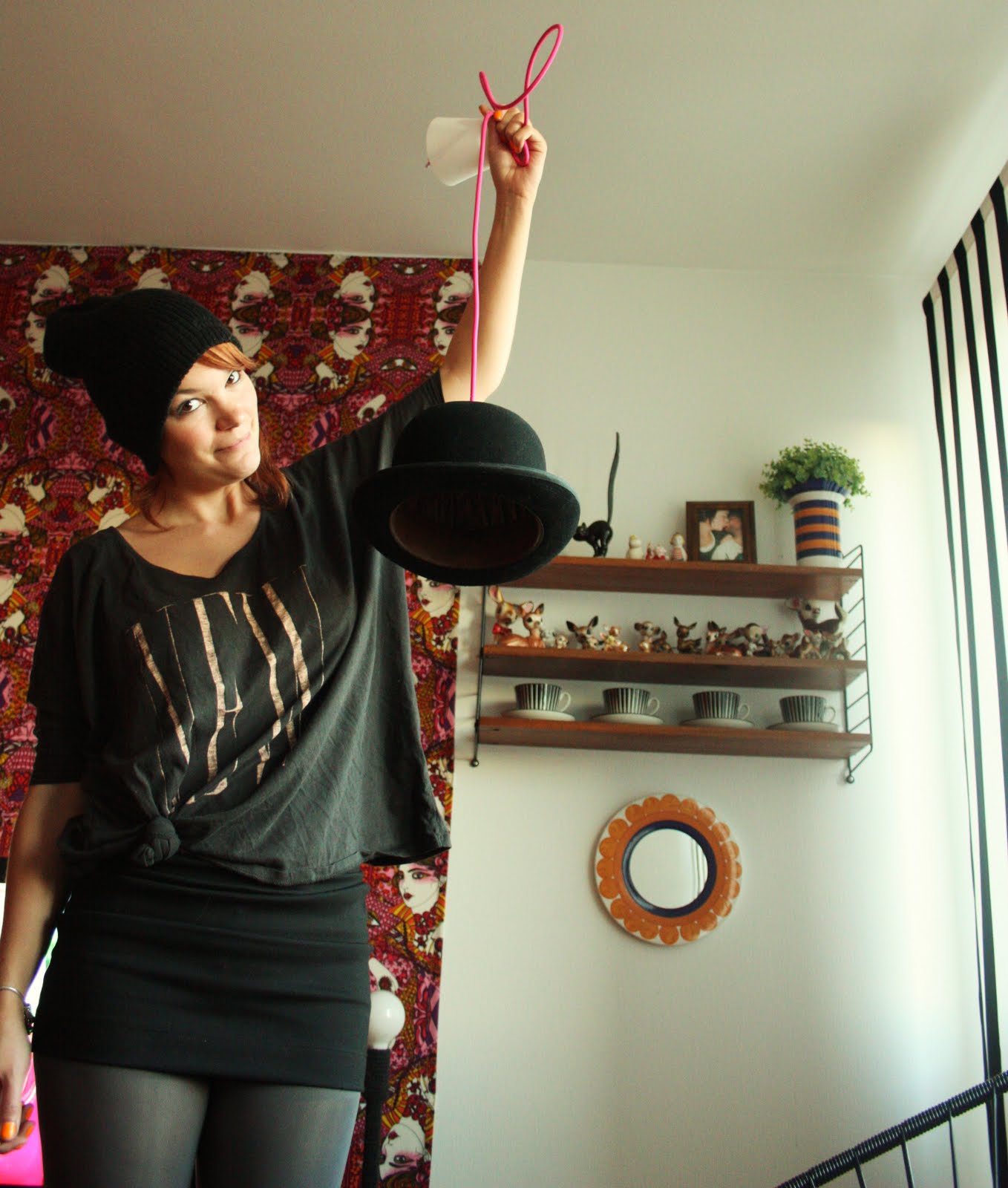 Så nu har vi vår lamphatt, dessutom med knallrosa sladd. Dock hamnar den inte över köksbordet utan i hallen, ungefär i höjd med hatthyllan.
